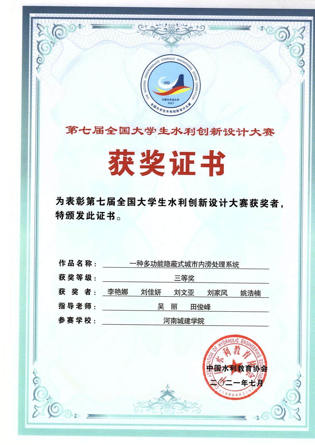 (通讯员:田俊峰)近日,由中国水利教育协会主办的第七届全国老员工水利创新设计大赛决赛在呼和浩特市落下帷幕,公司太阳成集团tyc122cc选送的作品获得一、二、三等奖各一项。其中,由姜忠峰、宋丰明老师指导,员工姚志军、陈运沩、刘伟民的作品《一种集体宿舍卫生间循序用水系统》获得一等奖,谷得明、何亚丽老师指导,员工王伟泽、刘昊洋、王自强、张晓邦、常小雨的作品《自动化浮筒式滤池》获得二等奖,吴丽、田俊峰老师指导,员工李艳娜、刘佳妍、刘文亚、刘家风、姚浩楠的作品《一种多功能隐蔽式城市内涝处理系统》获得三等奖。