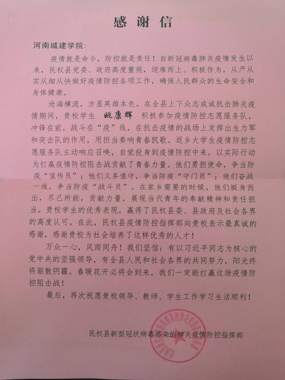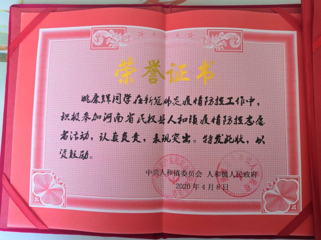 该生的优秀表现,赢得了民权县委、县政府及社会各界的高度认可。