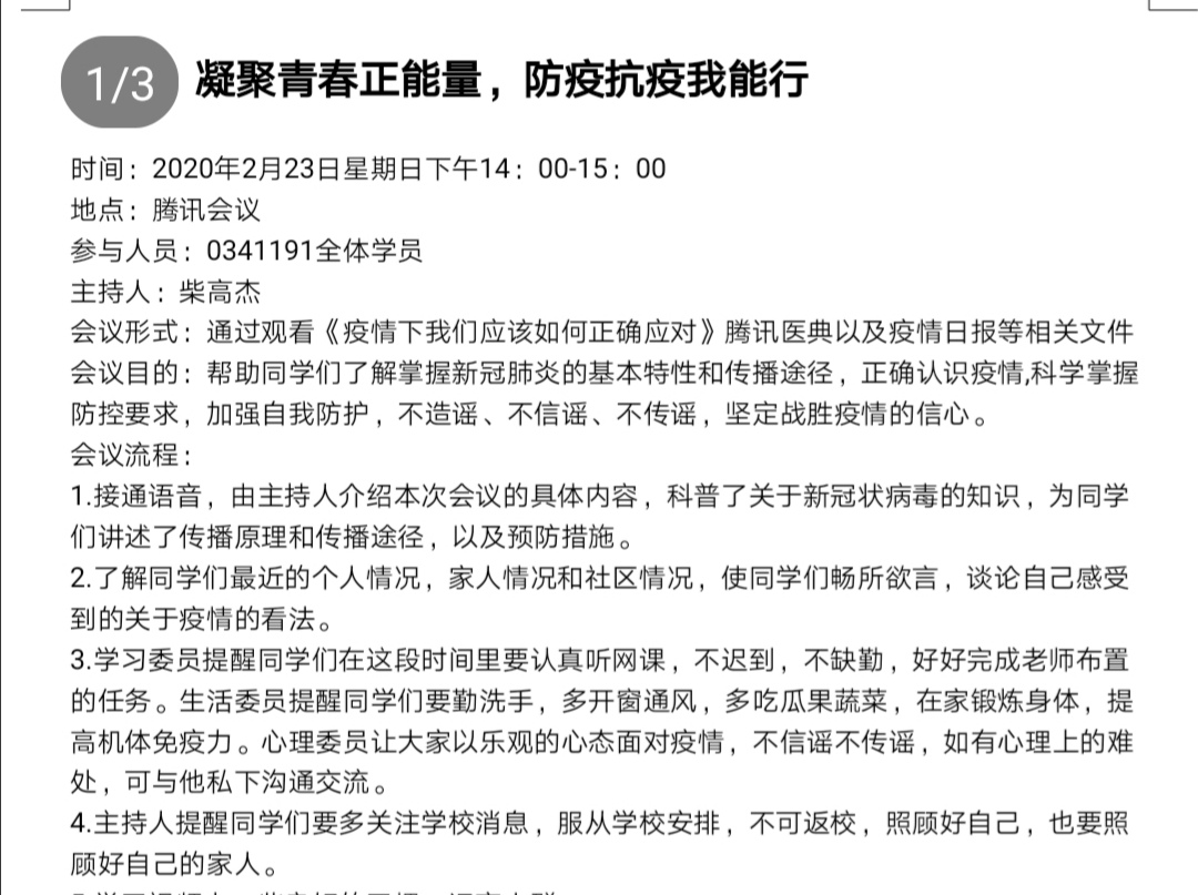 本次团日活动由各班团支部利用新媒体、直播软件、团支部微信群、QQ群开展线上活动,学习宣传抗击疫情过程中涌现出来的先进人物、先进事迹。首先由各班团支书对疫情发展进行报告,告诉同学们不必对疫情过度恐慌,但也不要放松警惕,告诫同学应该避免不必要的外出,减少户外活动,只有正确面对疫情才能有效的战胜它。接着团支书们在班群播放关于防疫的相关视频,同学们一同观看,积极主动参与讨论,针对此次疫情发表自己的看法,互相分享防疫知识,团结一致打好这场攻坚战。然后各班团支书对疫情期间各种谣言、诈骗进行举例,呼吁员工不信谣不传谣同时保护好自身财产安全,做知法懂法的老员工。最后团支书们对生活和学习问题进行总结,鼓励员工在家里规律作息,要求同学们做到“停课不停学、学习不延期”。号召同学们学习的同时不忘记体育锻炼,增加体质,提高免疫力。