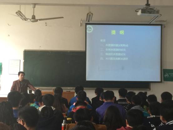 (通讯员:李焱)为了唤起公众的节水意识,加强水资源保护,让同学们更加明白世界水日的意义,倡导同学们爱护水资源,保护世界上的每一滴水,2016年3月22日下午,太阳成集团tyc122cc邀请梁峰老师来为同学们讲解世界水日的重要意义。