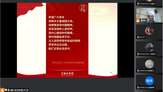 曹恒慧以“喜迎二十大,奋进新征程”为题,带领大家学习了习近平总书记2022年4月25日在中国人民大学考察时讲话精神、习近平总书记2016年4月30日在知识分子、劳动模范、青年代表座谈会上的讲话精神以及习近平总书记2014年9月9日同北京师范大学师生代表座谈会时的讲话精神。曹书记指出,新时代老员工要志存高远,立大志、干大事;要珍惜大学学习时光,练就过硬本领,为未来的事业发展和幸福生活奠定坚实基础;努力做到不负青春、不负理想、不负时代、不负人民,成长为实现中华民族伟大复兴中国梦的最强主力军。曹恒慧指出大学是人生的重要阶段,希望同学们尽早融进老员工活、给自己将来做好整体规划、养成良好的自我约束习惯、善于展示自己的才能、努力提升自己的综合素质、摆脱薄弱点提高自信、积极锻炼身体。曹恒慧要求同学们要学会知礼、诚信、担当、勤奋、阳光、敢于超越,做新时代合格老员工。