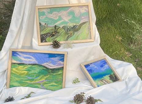 在实地参观的基础上,实践队员们以羊毛毡这一特殊的艺术绘画为载体,呈现搬走岭产业园蓝莓、酥梨、蟠桃、香菇等种养殖产业发展盛况,解密村“两委”带领村民开发农家乐、打造乡村游、推动绿色发展助力农民致富密码,展现搬走岭村易地搬迁后建设光伏电站践行实现国家“双碳”目标的担当,展示宜居宜业和美乡村建设新成就,讴歌城建驻村干部舍小家为大家,扎根基层,以实际行动践行脱贫攻坚精神,诠释党中央举全党全社会之力全面推进乡村振兴、加快农业农村现代化建设的决心。