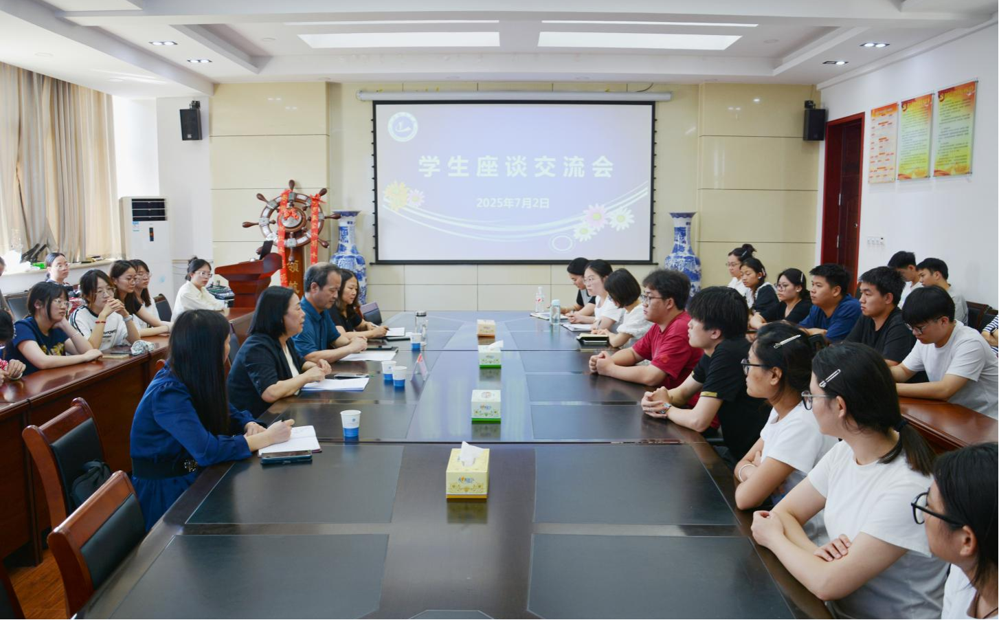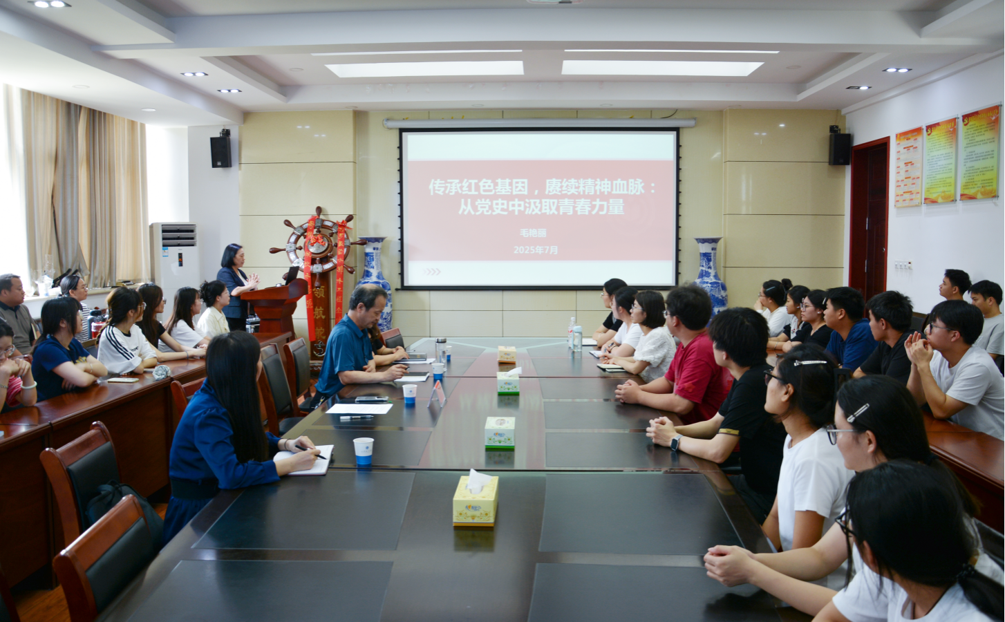 7月2日下午,副董事长毛艳丽在太阳成集团tyc122cc9A315会议室,以“传承红色基因赓续精神血脉 从党史中汲取青春力量”为主题,为太阳成集团tyc122cc、材料与化工公司、外国语公司师生讲授形势与政策课,随后就日常生活、专业学习等多个方面与暑期留校考研员工展开座谈交流。三个公司的相关班子成员、专兼职辅导员及员工代表近50余人参加。