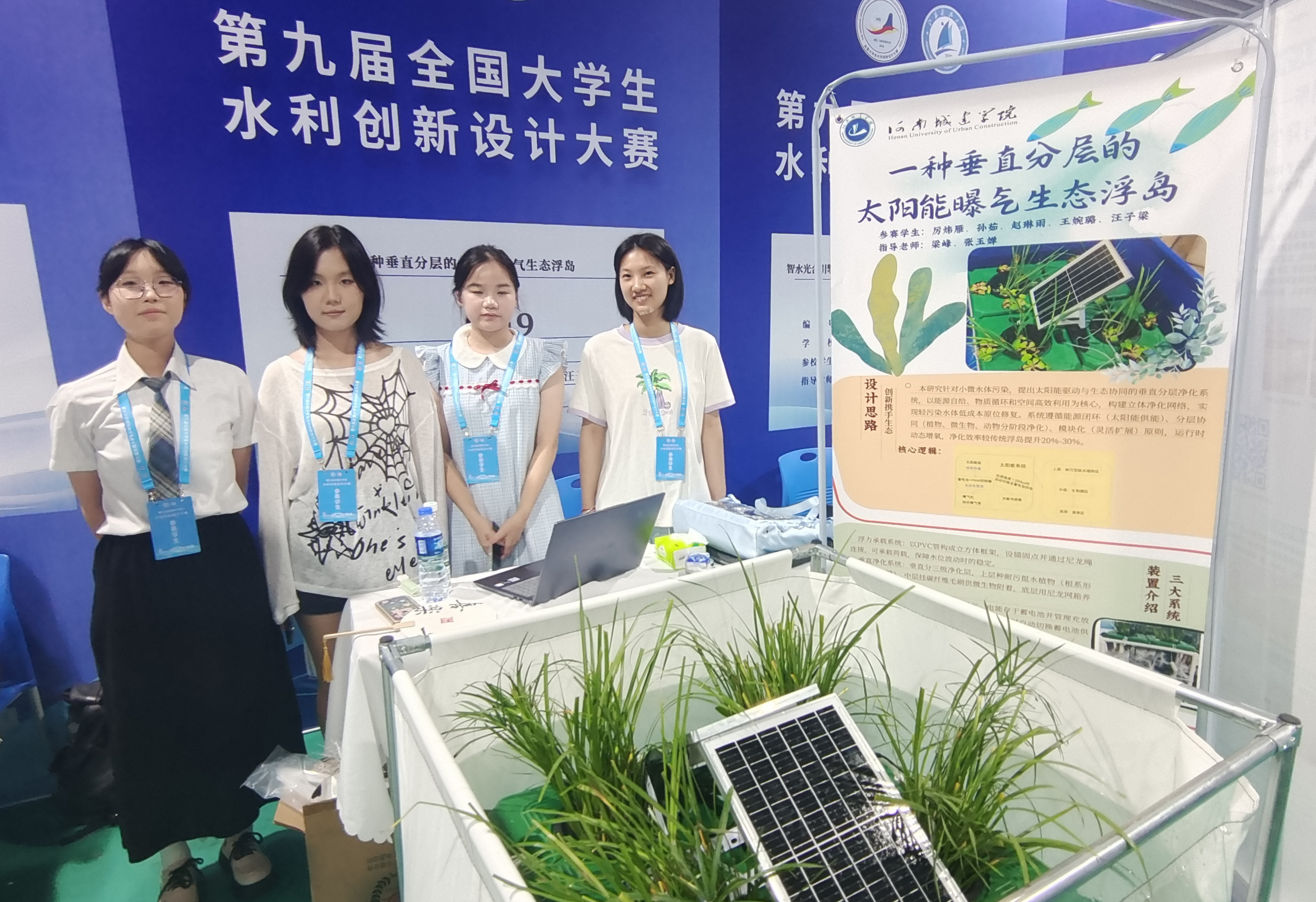 其中,由梁峰、张玉婵老师指导,厉炜雁、孙茹、王婉璐、赵琳雨、汪子梁等同学完成的作品《一种垂直分层的太阳能曝气生态浮岛》荣获一等奖;由王勇、刘凯老师指导,娄锦鼎、崇智玮、张向锋、陈梦瑶、肖毛润等同学完成的作品《基于多模态气泡调节的坝体减阻・防冻・清淤三效协同防护系统》荣获二等奖。