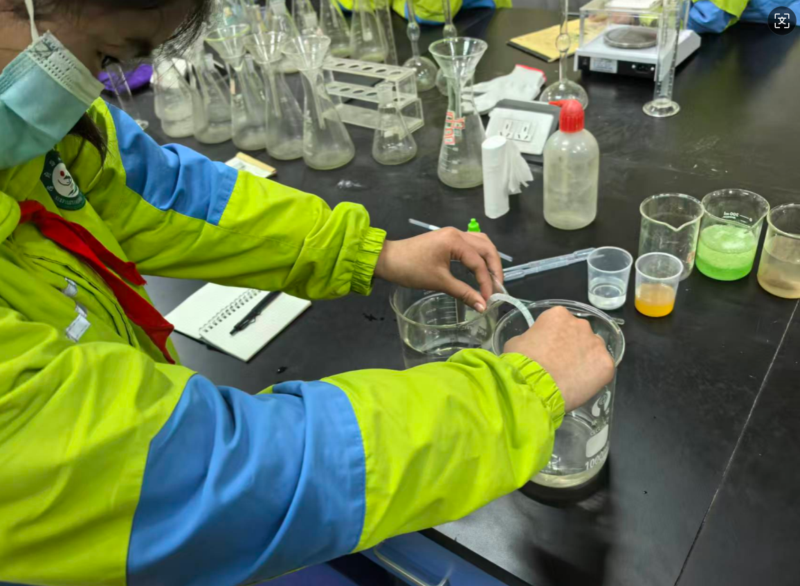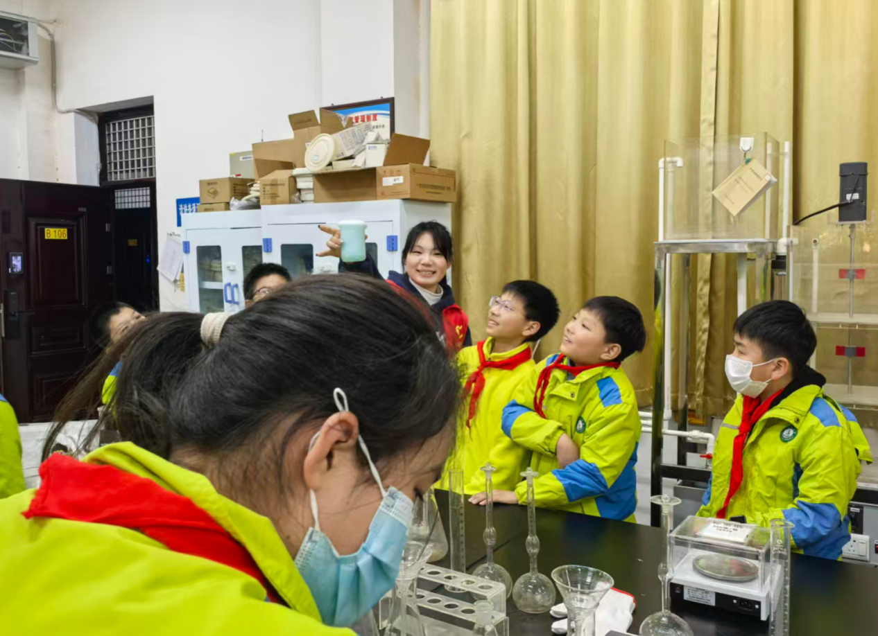 随后在老师们的引领下同学们走进实验室,开启趣味科普时光。志愿者通过趣味实验演示,带领大家探索水的奥秘:从模拟水体净化过程,见证浑浊污水逐步变清的神奇变化,到展示与水相关的趣味化学现象,色彩变幻与奇妙反应引得同学们阵阵惊呼。现场互动中,孩子们积极举手提问,在动手观察与主动思考中,深入理解水资源保护的科学原理,节水护水的种子在心中悄然扎根。活动期间,师生们不时驻足合影,定格下学习探索的珍贵瞬间。