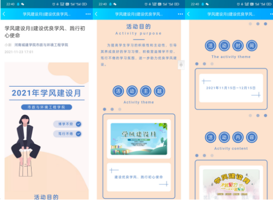 学风建设月活动期间,公司成立了学风建设工作领导小组,加强组织领导,落实学风建设月的方案和主体责任。利用展板、电子屏、QQ、微信公众号等媒体加强宣传教育,形成学风建设良好氛围;组织公司优秀员工开展学业宣讲以及考研、学习交流活动;辅导员组织开展学风建设主题班会、学业规划班会,了解班级学风状况,帮助员工分析查找学习方法、学习习惯等方面问题,指导员工制定“我的学业规划书”、学风建设倡议书、诚信考试承诺书并指导签字承诺;针对学业预警员工进行一对一谈话,联系学业指导老师进行针对性的帮扶;辅导员深入课堂学风督导工作,严格落实辅导员查课、听课制度;落实检查监督制度,成立卫生督察组,加大对于教室卫生、宿舍卫生及早、晚自习的检查力度并及时通报;开展无人售卖活动,通过“诚信小摊”的方式进一步营造了老员工诚实守信的校园风气。