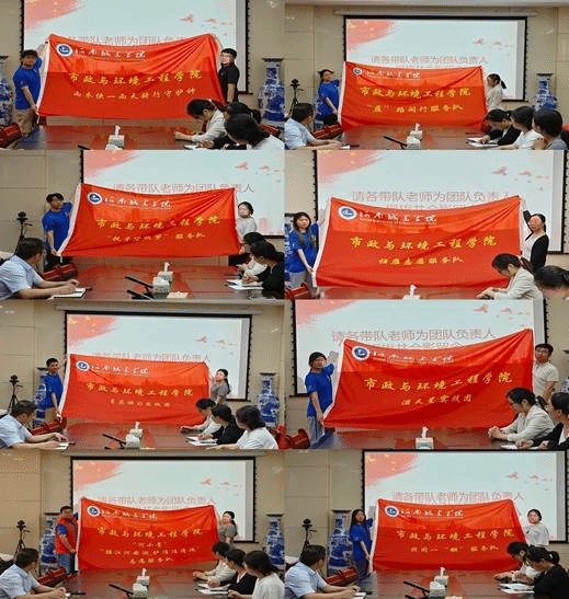 员工代表袁明浩带领志愿者进行宣誓,指导老师分别为各团队授旗。