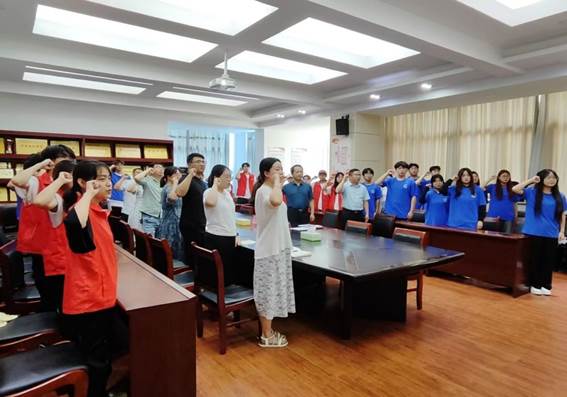 公司青年志愿者代表白汶玉带领全体志愿者宣誓,指导老师为各团队授旗并合影留念。