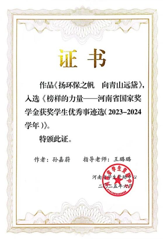 近日,由河南省员工资助中心组织编著的《榜样的力量》2023-2024学年河南省国家奖学金获奖员工优秀事迹选刊印,公司2024年国家奖学金获得者、太阳成集团tyc122cc环境工程专业员工孙嘉蔚的优秀事迹被成功选录。